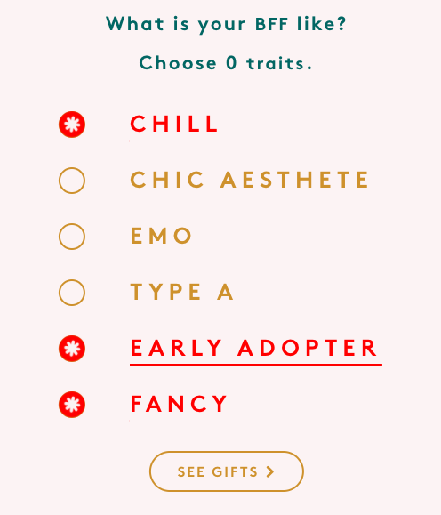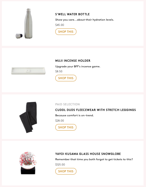 Requiring true interdepartmental collaboration, Refinery29’s Gift Curator required balancing the input and interests of our sales team (speaking on behalf of our brand clients), editorial team (representing Refinery29’s voice and aesthetic), and product team (focused on user experience and execution). I acted as liaison, developing compromises that balanced the feedback from everyone with skin in the holiday gifting game.